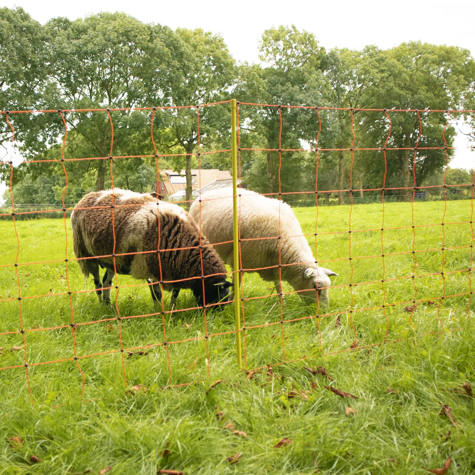 Lambavõrk oranžide hästi nähtavate postidega ja kahe naelaga – stabiilsem pehmel pinnasel ja tugevam tuule käes.